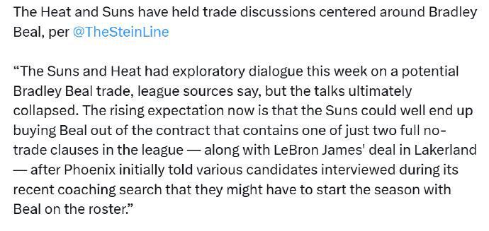 比尔昔日与奇才签订顶薪合同时,因为加入了交易否决权,从而导致太阳交易比尔存在巨大的障碍。上赛季太阳就在兜售比尔,却并未能够成功,如今太阳依然渴望兜售比尔,但因为他还剩下2年1.1亿美元的大合同,也是无人问津,他们与热火的交易谈判已经失败。